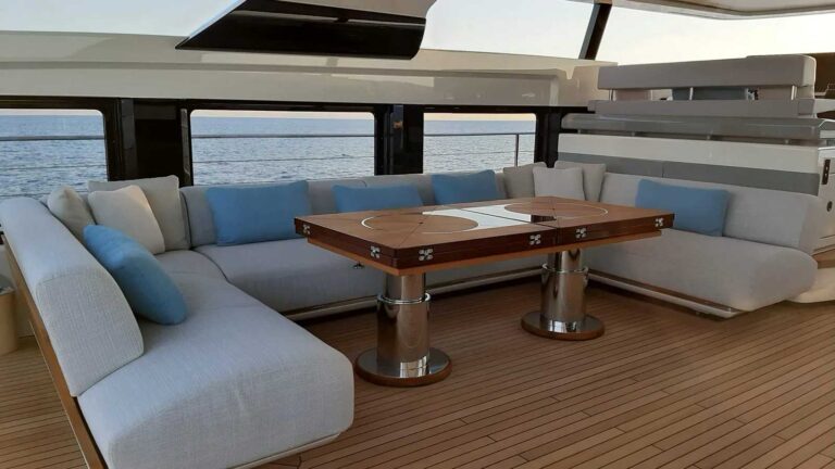 Gli interni del Club M si caratterizzano per lo stile sofisticato e contemporaneo, con il salone principale che accoglie gli ospiti in un’atmosfera armoniosa che si integra con la sala da pranzo formale. Cinque cabine possono accogliere fino a 12 ospiti mentre sono presenti alloggi dedicati per un equipaggio di cinque persone.
