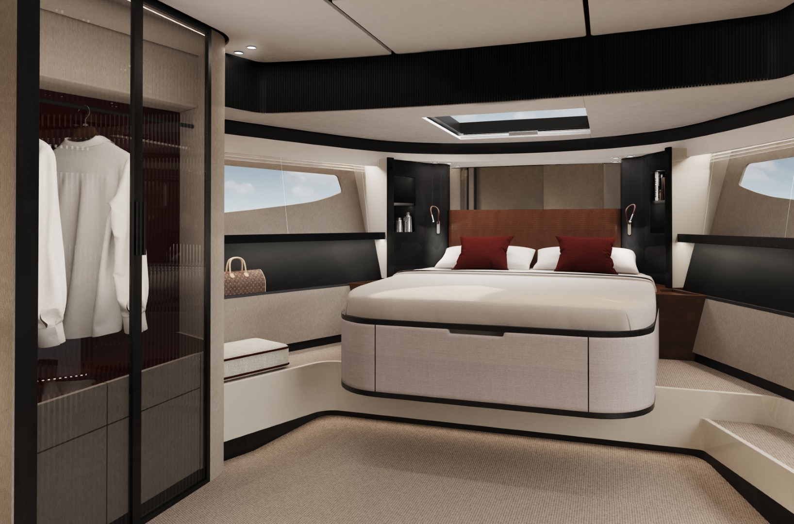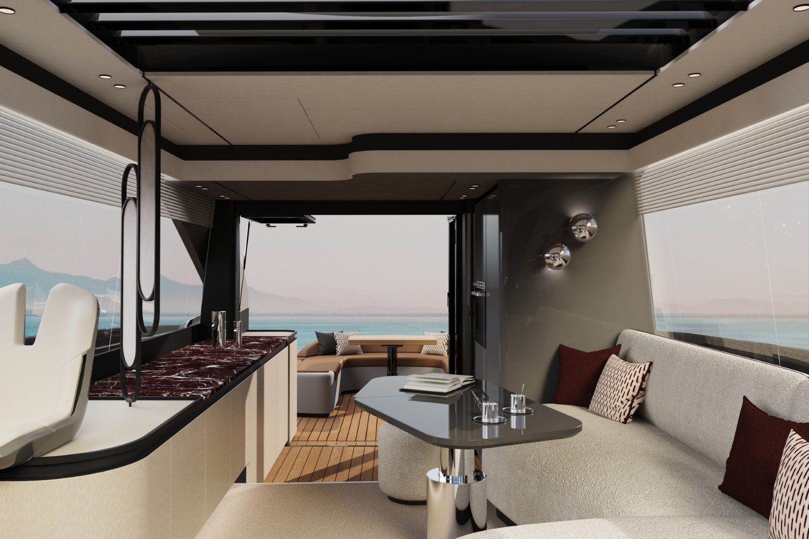 A bordo, la configurazione degli ambienti punta su funzionalità e comfort. Il flybridge ospita una seconda postazione di guida e aree per il relax. Il main deck è pensato per la socialità, mentre sottocoperta gli ambienti sono distribuiti per garantire privacy e abitabilità. L’ergonomia di guida è al centro del progetto grazie alla Fim Driving Experience, sviluppata con Designworks (Bmw Group), già vista sulla 640 Contessa. L’interfaccia di comando, i materiali e la disposizione della plancia richiamano standard automobilistici.
