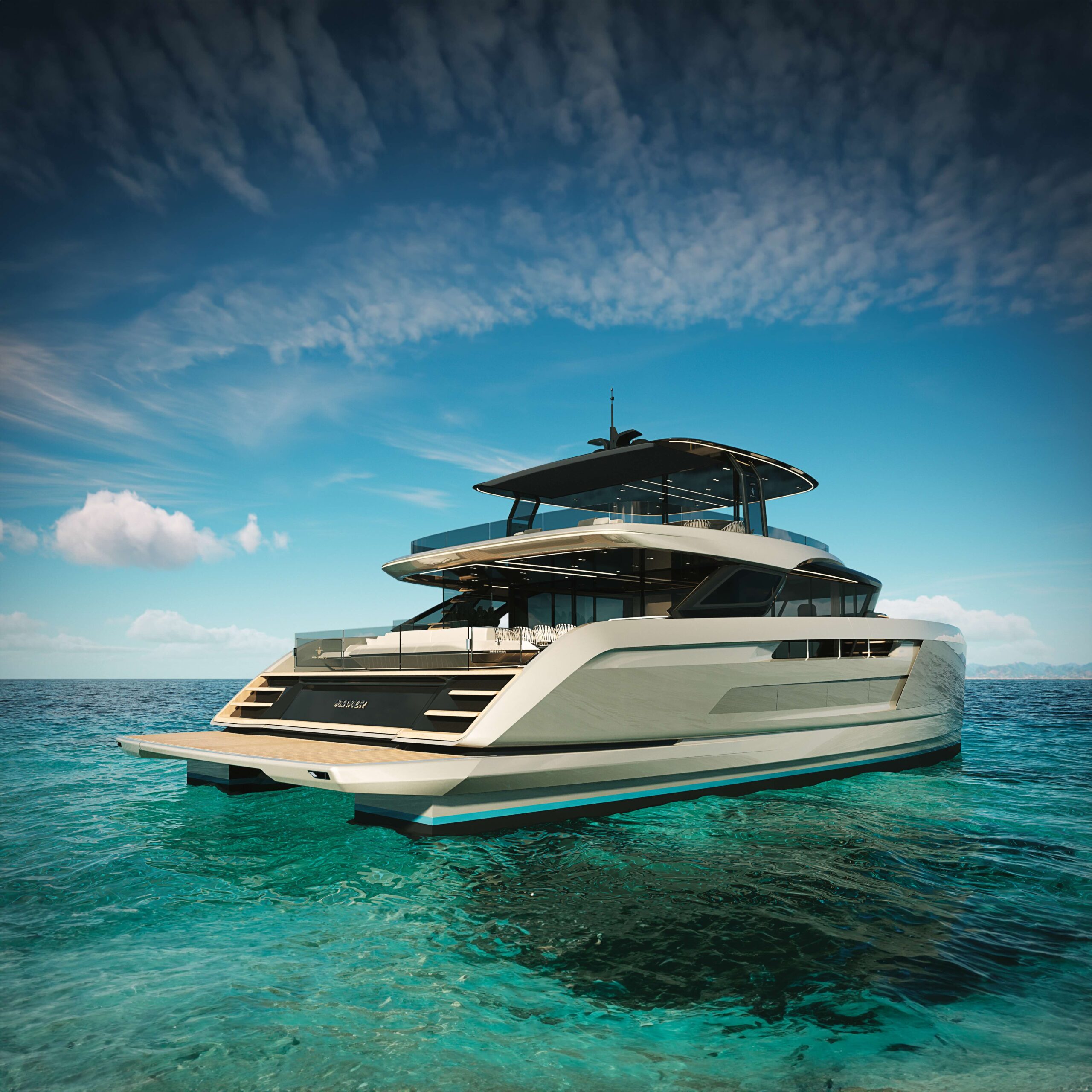 Il Dolomia D100 rappresenta il manifesto del nuovo marchio. È lungo 72 piedi, ma offre spazi equivalenti a quelli di un monocarena di 100 piedi: circa 300 metri quadri calpestabili tra interni ed esterni, che lo collocano già nella categoria dei superyacht.