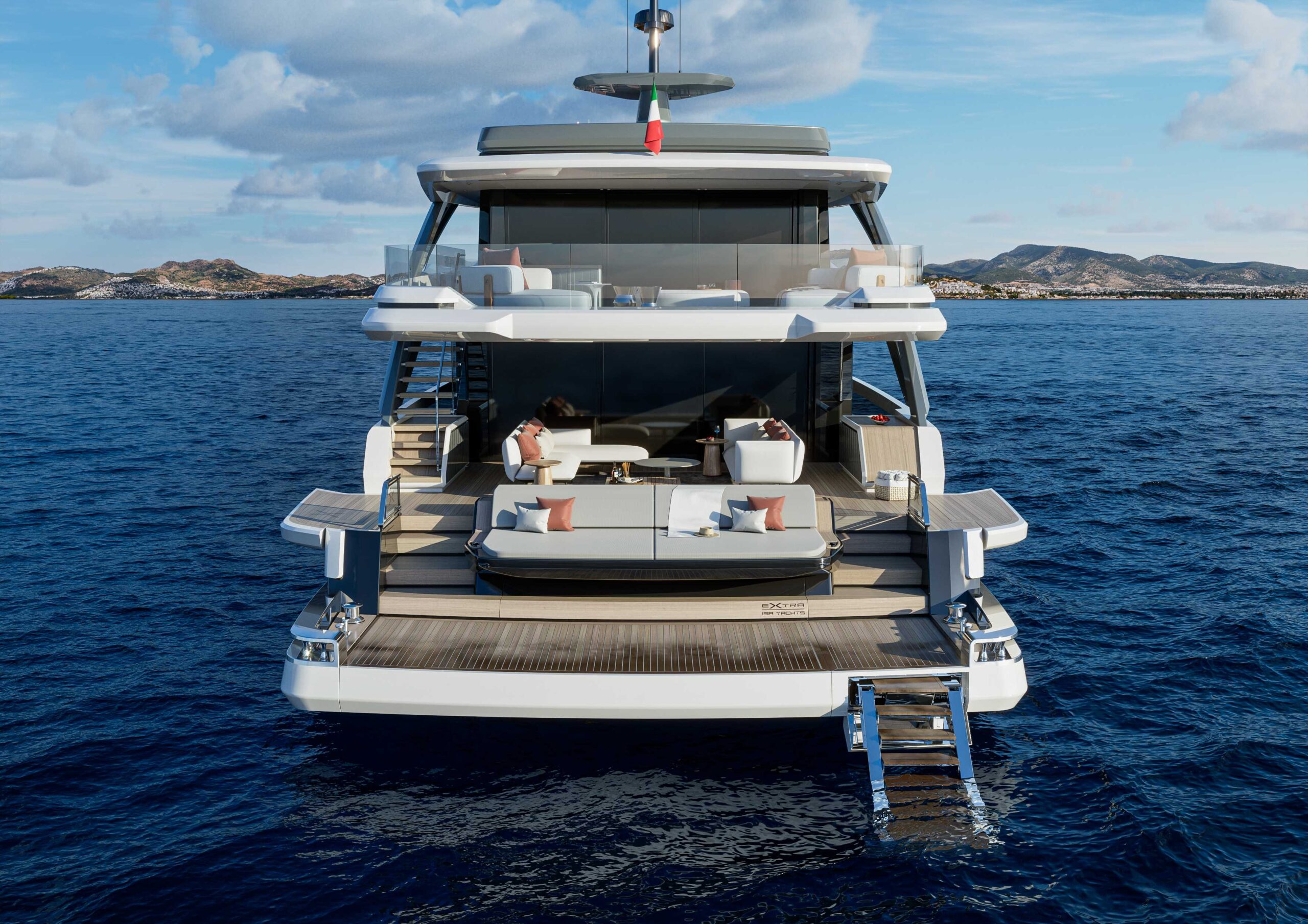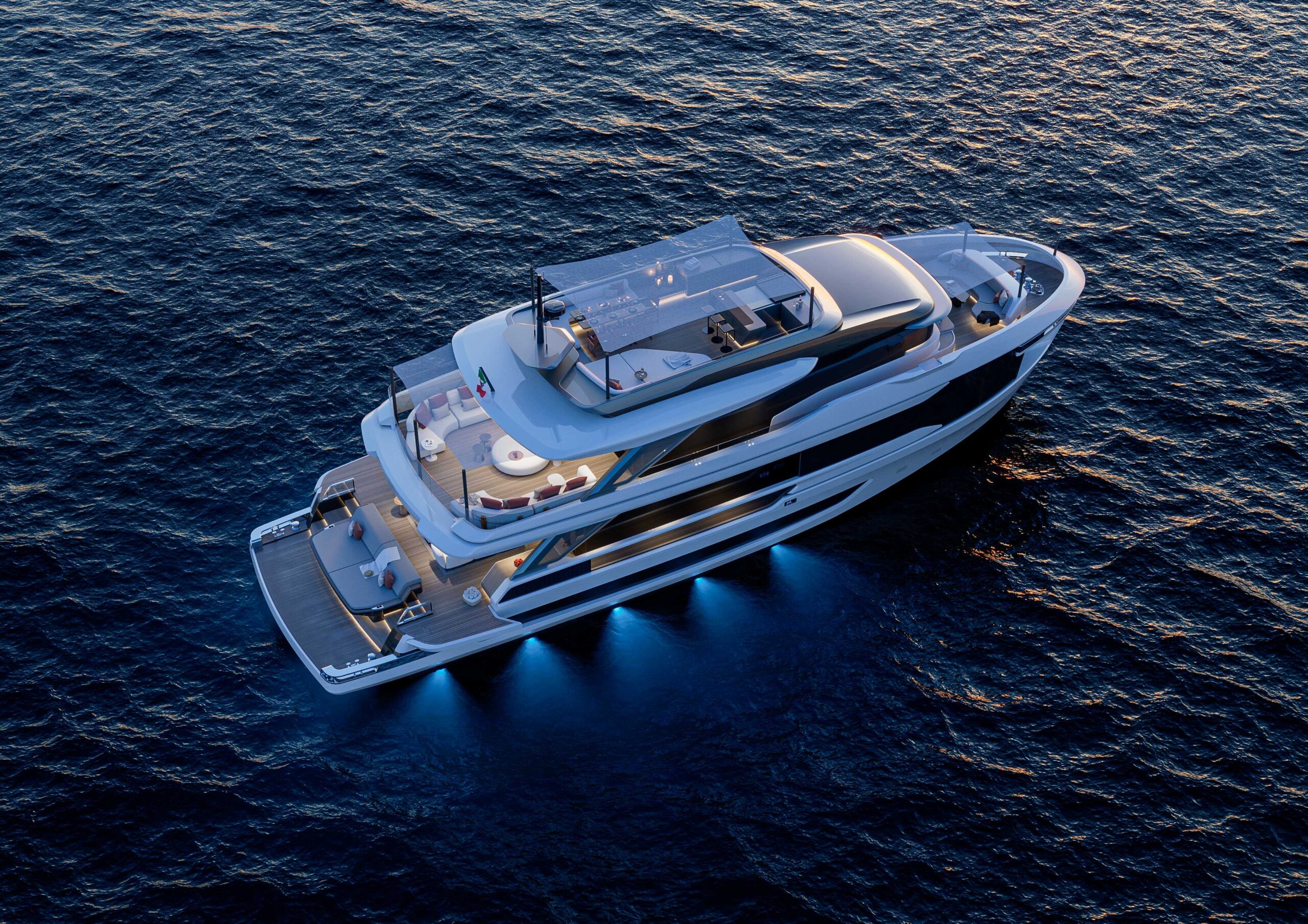Il pozzetto di poppa, sviluppato su due livelli, offre un’area prendisole e un salotto informale collegati tra loro, arricchiti da terrazze laterali abbattibili che esaltano l’effetto infinity. L’upper deck ospita una lounge con arredi modulari e un’area esterna con bar, zone relax e tavolo da dieci posti, mentre il sun deck è progettato per vivere momenti conviviali in totale libertà.