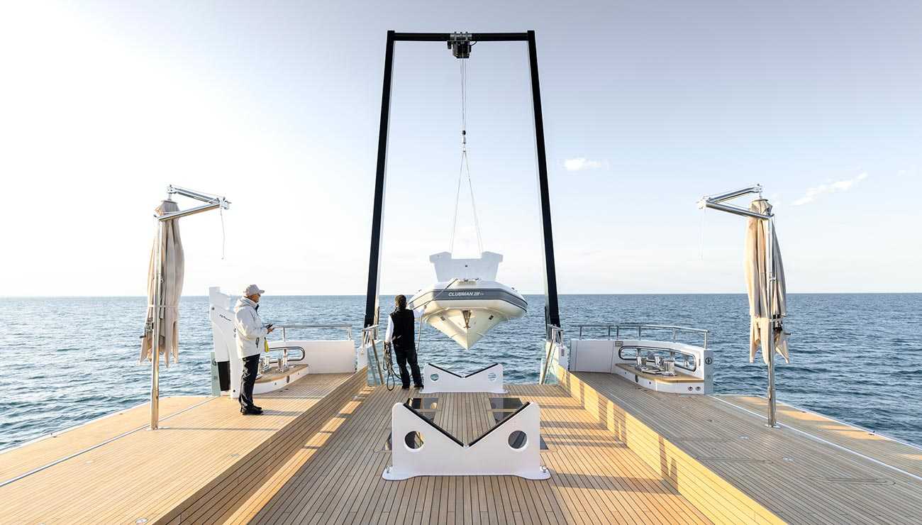 Il design si distingue per soluzioni altamente innovative e orientate alla vita di mare. Tra queste: l’esclusiva configurazione del ponte principale asimmetrica, che ottimizza gli spazi e i percorsi a bordo. L’area di poppa si trasforma in un magnifico beach club. Le murate abbattibili creano una spettacolare terrazza sul mare di circa 115 metri quadrati. Il ponte di poppa integra intelligentemente una gru in fibra di carbonio da 3 tonnellate capace di varare un tender di 27 piedi, garantendo la massima funzionalità senza sacrificare lo spazio per gli ospiti, ed infine un tocco di lusso distintivo è dato dalla straordinaria cantina per vini su due livelli integrata nella scalinata.