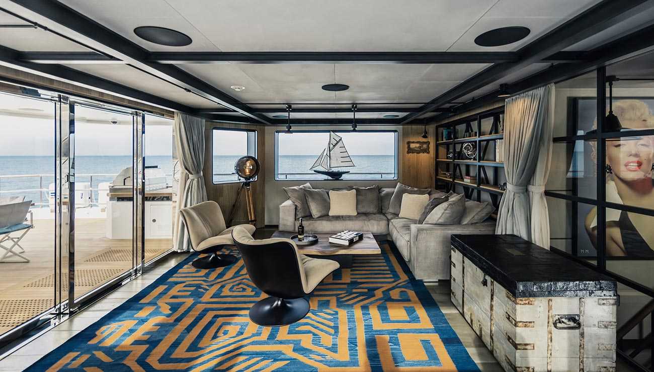 Il salone principale è inondato di luce naturale grazie alle ampie finestre panoramiche a dritta. Per chi non vuole rinunciare all’allenamento, il ponte inferiore a poppa ospita una palestra completamente attrezzata con lucernari, unendo funzionalità e uno stile di vita raffinato a bordo.