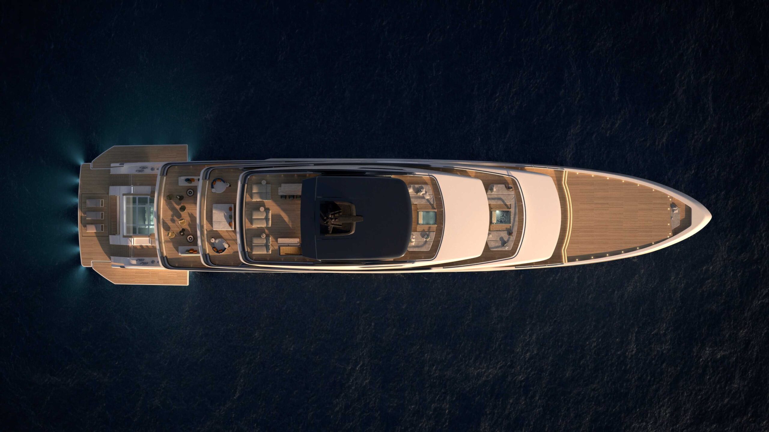 Il sun deck presenta una zona dining al fresco, un bar/cucina, una lounge con braciere, una seconda vasca idromassaggio a prua e un frangivento in vetro trasparente sotto l’hardtop. La piscina principale a poppa del main deck ha un fondo in vetro che illumina il sottostante beach club.