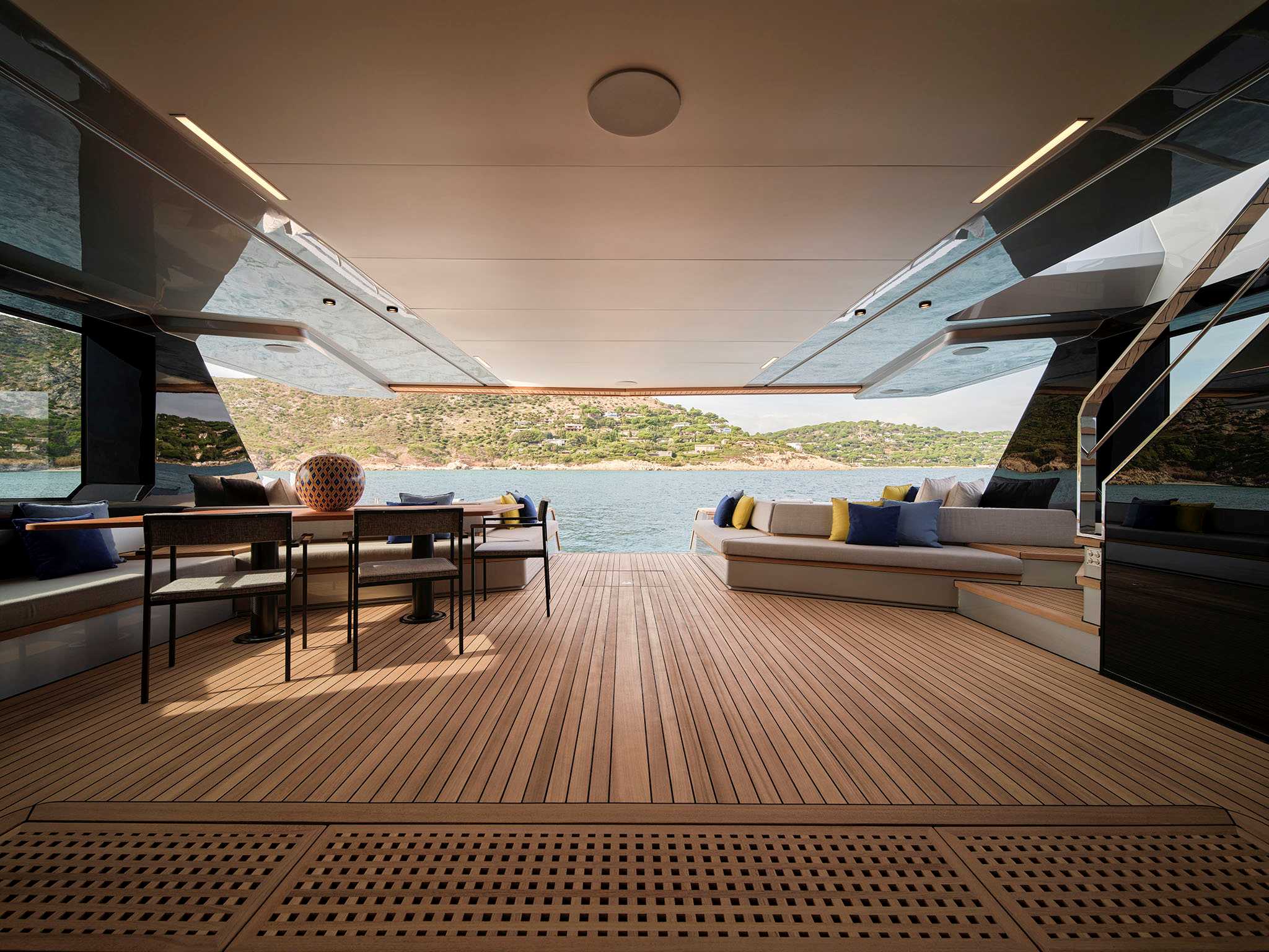 L’area esterna del beach club si estende grazie all’apertura delle ali laterali pieghevoli, la piattaforma da bagno idraulica funge anche da passerella. A poppa, l’area è stata concepita per la massima funzionalità: un tender di oltre 4 metri e water toys sono riposti in modo discreto dietro le ali del beach club.