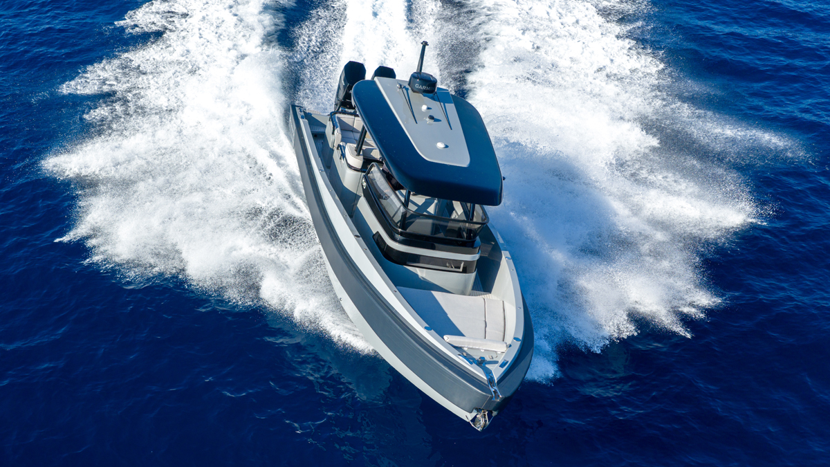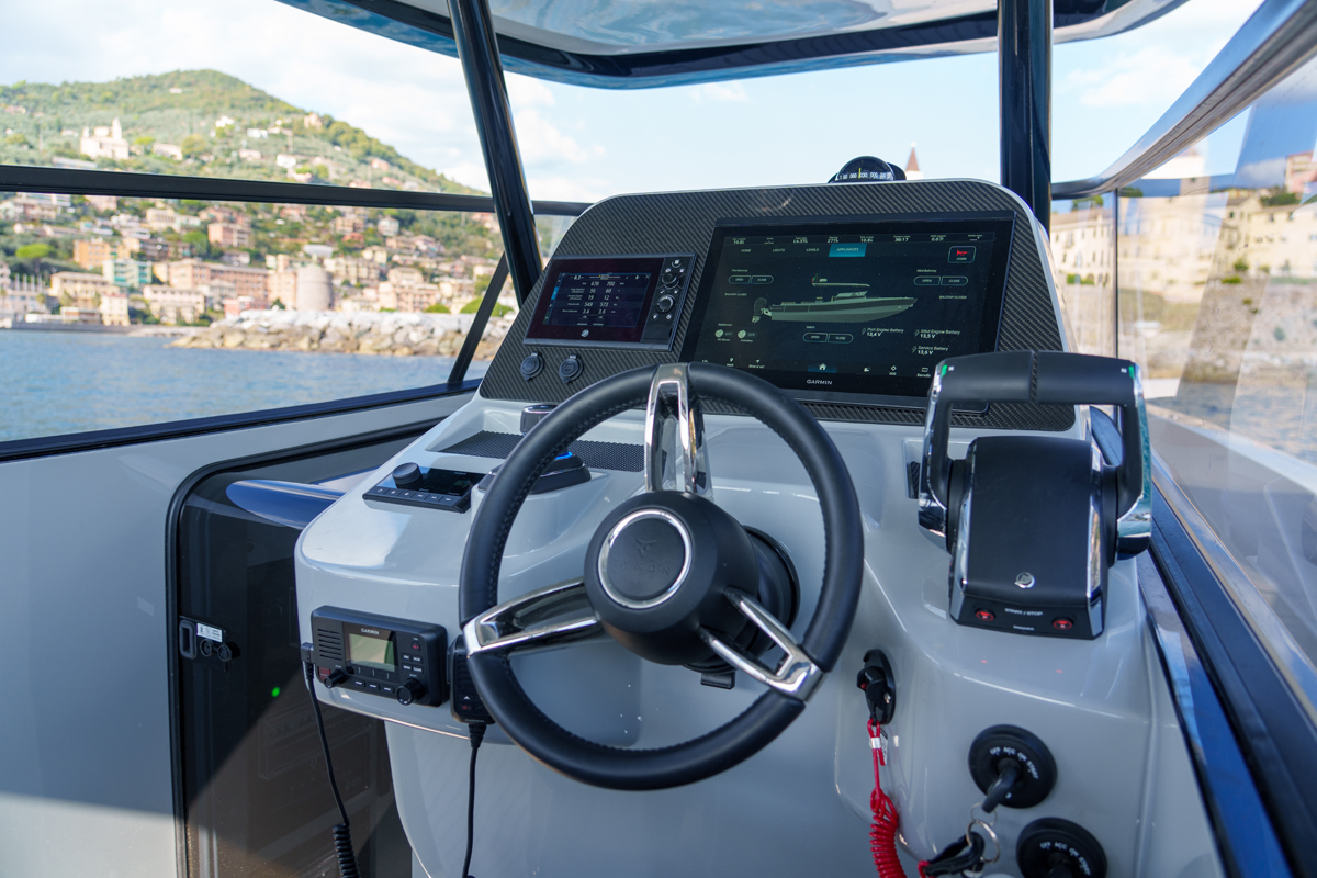 Sottocoperta troviamo una cabina con cuccetta a V, bagno elettrico e materiali di finitura personalizzabili rendono la barca adatta anche a brevi crociere. Il wet bar centrale, configurabile con frigorifero, lavello e grill, riflette la stessa logica modulare che caratterizza ogni area. Gli impianti sono gestiti da una console in carbonio stampata in 3D con display multifunzione da 16 pollici Garmin, sistema Vhf, radar da 18 pollici e joystick elettronico integrato.