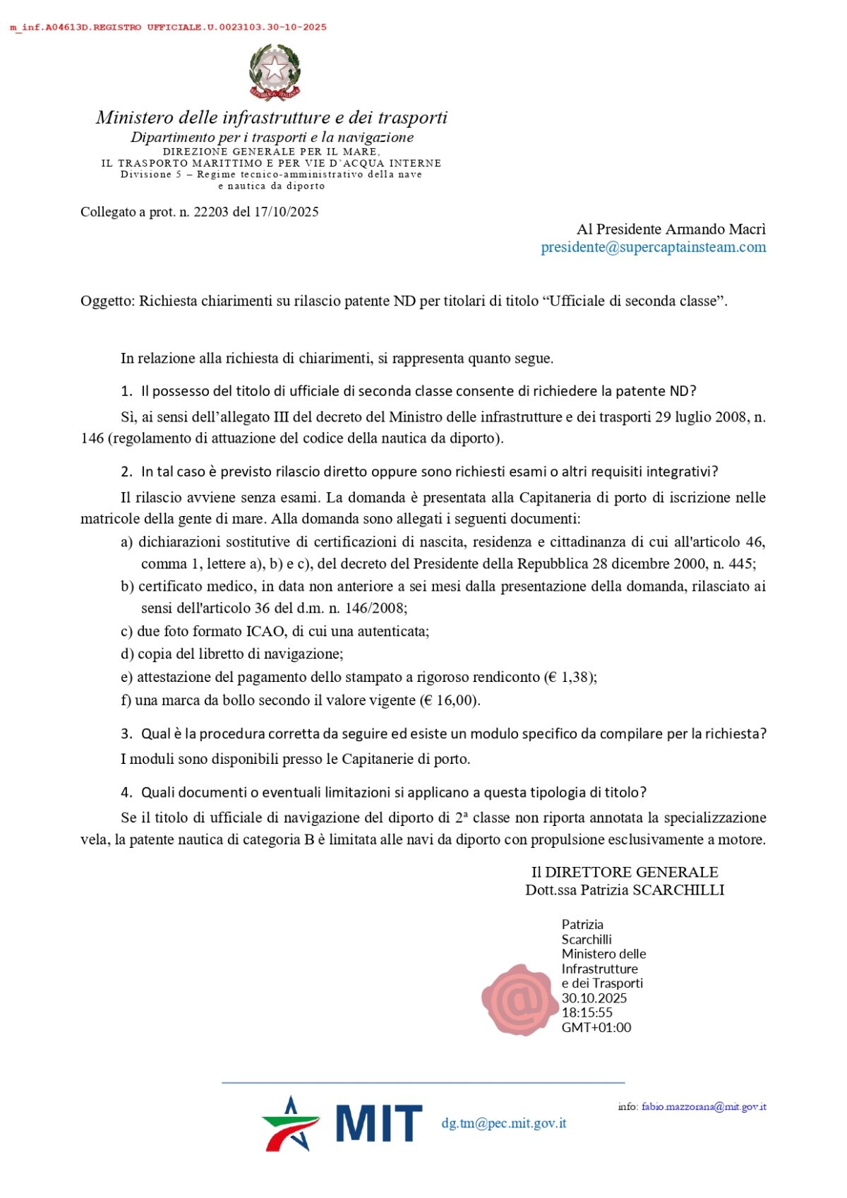 Il Ministero delle Infrastrutture e dei Trasporti ha fornito un chiarimento per i professionisti della nautica da diporto. Su richiesta dell’associazione sindacale dei capitani Super Captains Team, firmata dal presidente Armando Macrì, con oggetto “Richiesta di chiarimenti su rilascio patente Nd per titolari di titolo “Ufficiale di seconda classe””, il Mit ha risposto confermando che i titolari del nuovo titolo di Ufficiale di navigazione del diporto di 2a classe possono ottenere la Patente Nautica Nd (per navi da diporto) ai sensi dell’allegato III del decreto del Ministro delle infrastrutture e dei trasporti 29 luglio 2008, n. 146 (regolamento di attuazione del codice della nautica da diporto), e senza sostenere ulteriori esami.