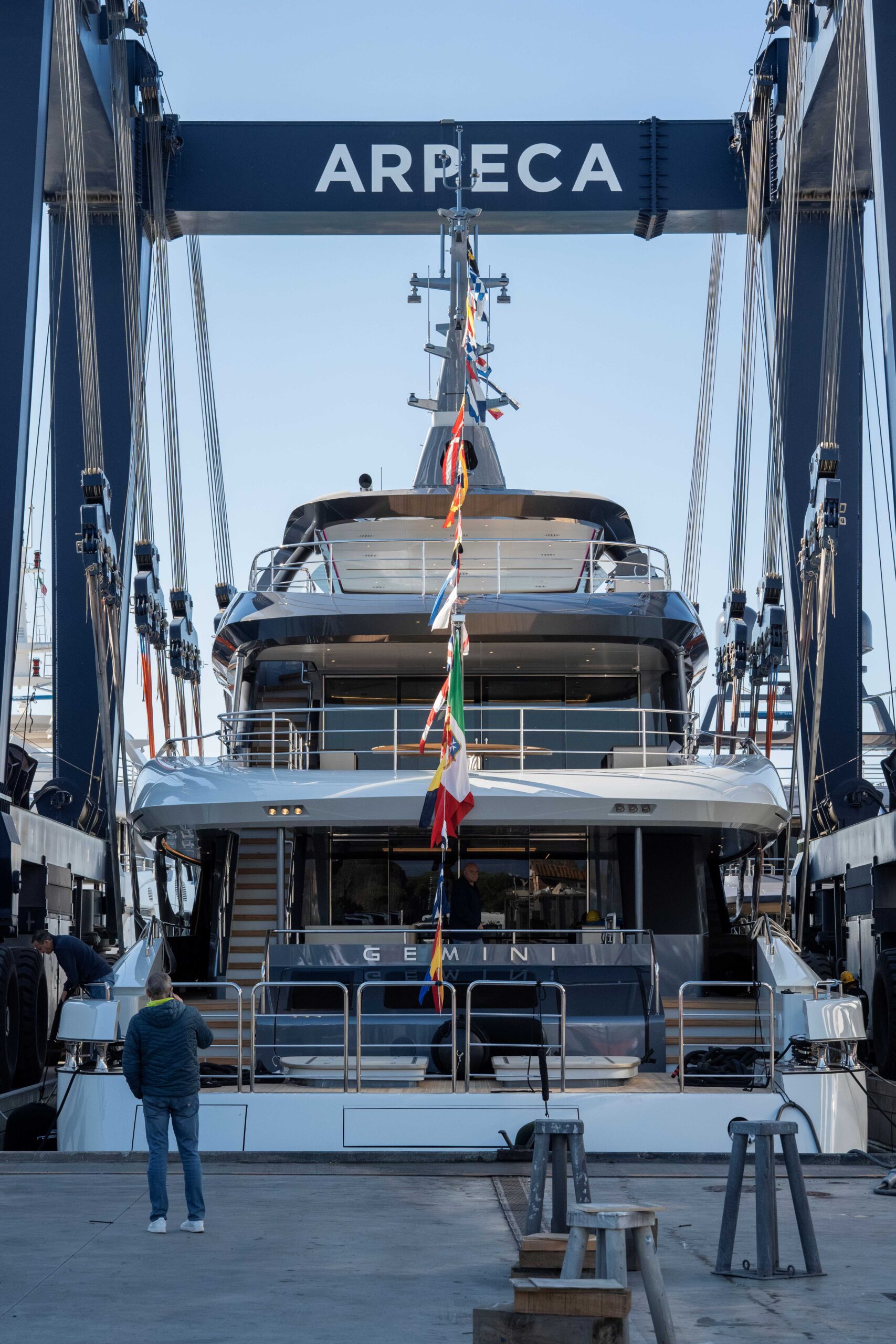 Il Gemini dispone di una larghezza di 9,12 metri e una stazza lorda inferiore a 500 Gt. Il design esterno, curato da Fulvio De Simoni Studio, conferisce all’unità un profilo filante e deciso, mentre gli interni firmati da The Touch Studio contemplano ambienti sofisticati ma al tempo stesso invitanti. L’architettura navale è stata sviluppata dallo studio Arrabito Naval Architects.