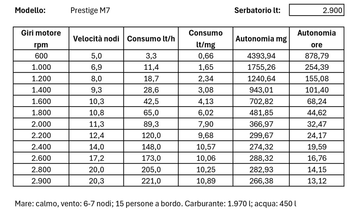 La suite armatoriale è a prua, misura oltre 20 mq e comprende bagno, scrivania e ampi spazi di stivaggio. Completano la zona notte una cabina Vip di 10 mq, due cabine ospiti (8 e 6 mq), una cabina equipaggio doppia standard (5 mq) e una per lo skipper singolo su richiesta. Materiali e finiture sono di alto livello, con uso di legno, tessuti naturali, pelle e dettagli in bronzo. La carena è firmata Marc Lombard Yacht Design, ottimizzata per la propulsione a motore con scafi asimmetrici concavi e struttura irrigidita per migliorare la tenuta e ridurre i rumori d’impatto. La configurazione con due motori Volvo D8 da 550 cavalli consente una velocità di punta di 22 nodi e una crociera ideale di 17 nodi. A 8 nodi, con serbatoi standard, l’autonomia è di 1.220 miglia nautiche, che salgono a 1.430 con i serbatoi opzionali. Il Long Staying Package include una capacità carburante maggiorata (fino a 3.400 litri) e serbatoio acque grigie da 340 litri. Con il Silent Mode Package – 16 mq di pannelli solari, batterie al litio e gestione ottimizzata – si può restare all’ancora in silenzio fino a 12 ore. Il Prestige M7 è pensato per armatori che cercano volumi ampi, autonomia, stabilità e personalizzazione. È costruito nel cantiere Bénéteau di Monfalcone e combina capacità produttiva industriale e cura artigianale.