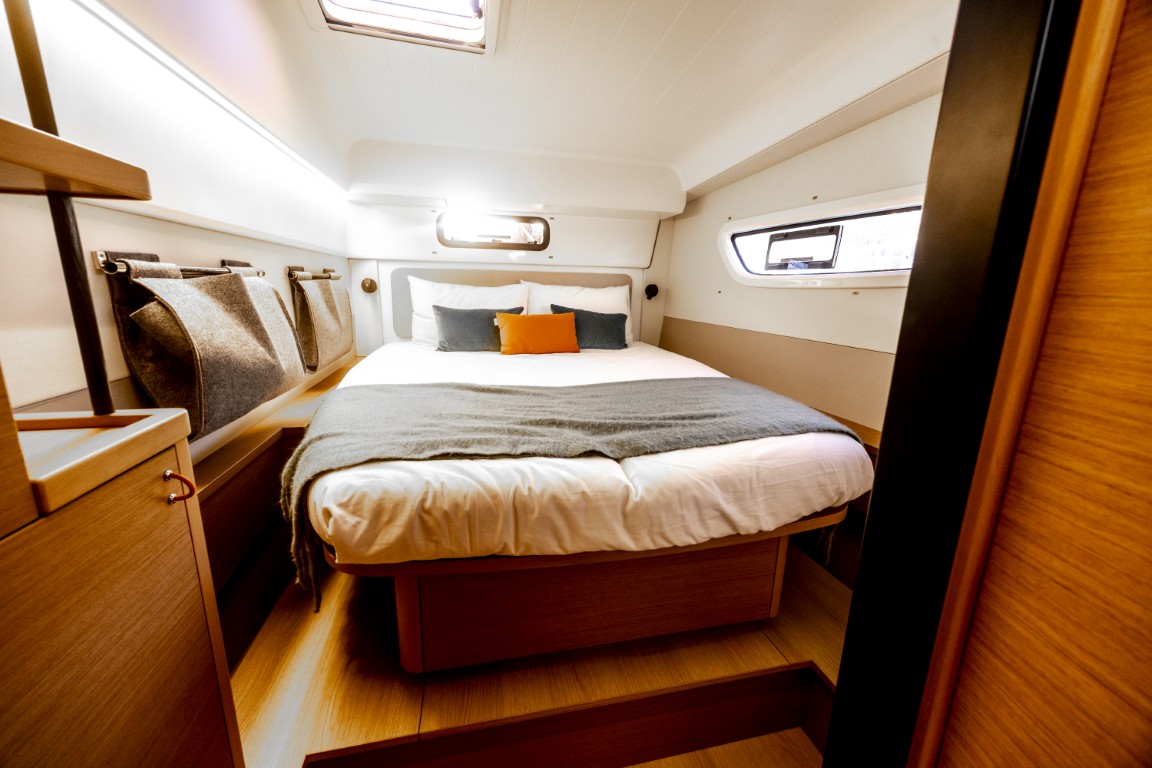 Lo scafo messo a disposizione dal cantiere per le prove è il numero 1, attrezzato con i pack Sail Away, Pulse Line e Fast&Curious per gli interni: le dotazioni accessorie più interessanti riguardano il piano velico con la randa square top, il genoa Elvstrøm Sail in materiale laminato eXrp Ekko con albero (Performance), boma, pulpiti e corrimano laccati in nero per un elegante tocco estetico. Tutte le manovre sono accessibili dal timoniere che rimane sempre in pozzetto, senza sparire al ‘piano superiore’ come accade in altri modelli. I winch sono Harken con il primario elettrificato, l’elettronica è invece Garmin con un display da 12” GpsMap per ogni timoneria. A poppa invece la rotaia del randa con winch dedicato che serve anche a varare e alare il tender tramite le due apposite gruette. La freschezza del nuovo team progettuale di nota subito con la prima novità subito evidente appena si sale a bordo: le due plancette di poppa non sono più aperte come in passato ma chiudibili con un portellone manuale per una maggior sicurezza in mare aperto. Le due sedute del timoniere forniscono ulteriore protezione e si sollevano verticalmente per lasciare libero il passaggio verso poppa. Sul ponte principale pozzetto e salone sono in perfetta comunicazione grazie a una vetrata più ampia e alla cucina che si affaccia verso poppa, lasciando libero un pratico spazio per accedere al bancone. Negli interni si apprezza il nuovo stile creato dal team di Jean-Marc Piaton con colori, materiali e finiture che rompono con il passato permettendo anche di risparmiare peso. In salone spiccano il tavolo da carteggio nella parte frontale, la dimensione extra large delle finestre e i frigoriferi standard. La versione in prova è quella a tre cabine e tre bagni con lo scafo di dritta interamente dedicato all’armatore: letto matrimoniale verso poppa, zona relax/ufficio al centro (da notare la nuova libreria, leggera ed elegante), grande bagno con guardaroba e box doccia separato nella parte di prua. La porta che separa la zona notte dal bagno ha una doppia funzione: quando è chiusa permette a chi traffica in questo spazio di non disturbare chi riposa, quando è aperta a sua volta chiude l’armadio guardaroba. Lo scafo di sinistra è invece tradizionale con due cabine matrimoniali e al centro una coppia di bagno con doccia al centro in comune; anche qui si trovano le due porte a doppia funzione che chiudono le cabine e l’armadio. È anche disponibile una versione con quattro cabine e altrettanti bagni. L’Excess 13 era in categoria Family insieme ai monoscafi Dufour 48, Oceanis 52, Sun Odyssey 415 e ai catamarani Fountaine Pajot 41, Lagoon 38 e Leopard 46, l’unico non made in France di questa categoria, la più numerosa.
