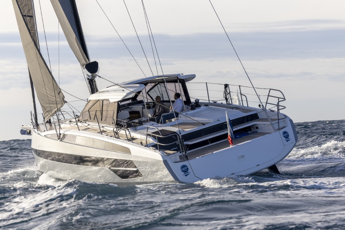 Gli interni, a cura dello studio francese Roseo Design di Stéphane Roseo, si distinguono per i due layout, Propriétaire (la versione in prova) e Grand Voyageur, con quest’ultima che offre una cabina armatoriale meno spaziosa e più volumi di stivaggio/tecnici. Da sottolineare la completa assenza di rumori e scricchiolii durante la navigazione, un aspetto importante che evidenzia la qualità di costruzione. Le cabine sono tre, servite da altrettanti bagni (quello centrale della cabina ospiti serve anche come daily toilet) mentre la cucina sfrutta tutto lo spazio tra il salone e la suite armatoriale con ampio spazio dedicato al freddo: frigorifero con freezer da 130 litri + frigo/freezer a cassettoni da 80 e 64 litri. Il 55 ha scafo e coperta realizzati in infusione con sandwich di vetroresina e anima in Pet, rinforzi in laminato solido e carbonio son presenti nelle aree sottoposte a maggiori sforzi mentre un ragno strutturale è laminato allo scafo. Il 55 è il primo modello del cantiere a essere nominato per l’European Yacht of the Year dal 2019, quando il Pilot Saloon 42, ultima barca della vecchia gestione, finì nella categoria Luxury Cruiser poi vinta dal Sunbeam 46.1. Wauquiez torna e si aggiudica, con merito, la categoria Luxury nella quale quest’anno hanno navigato barche come il Cnb 62, il Saffier SL 46 e il catamarano Vaan R5.