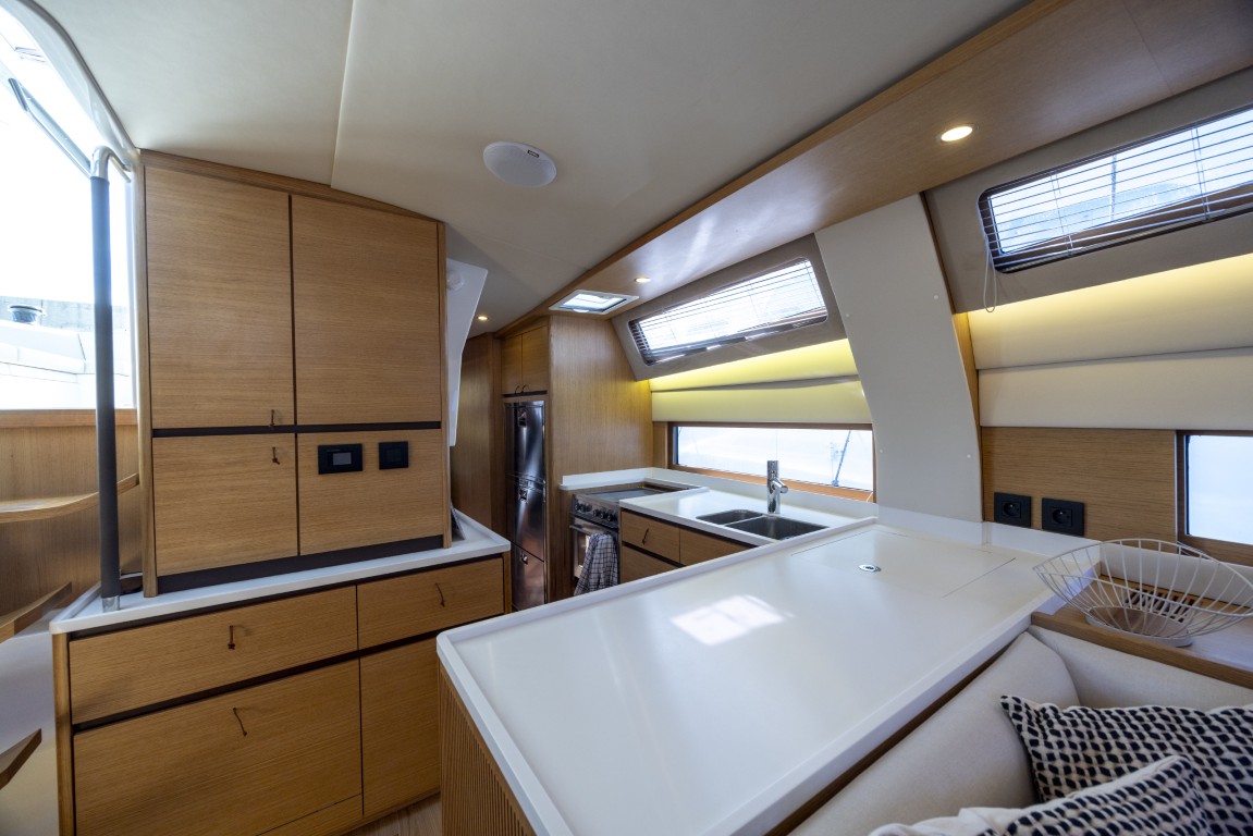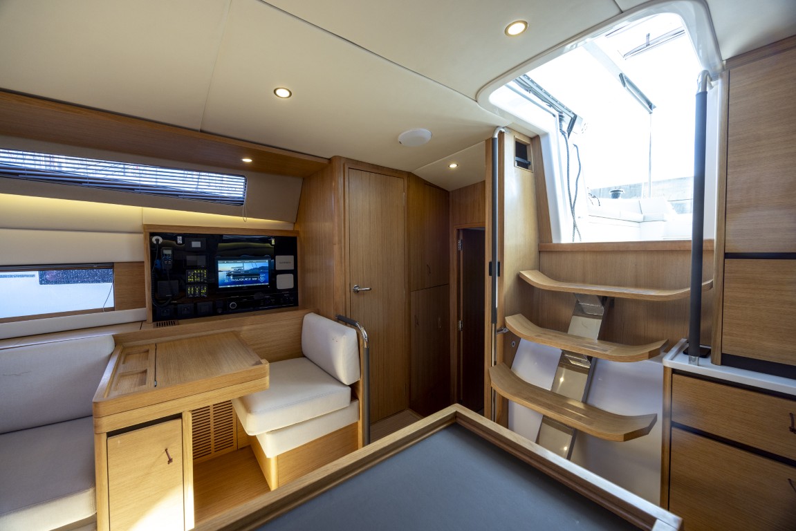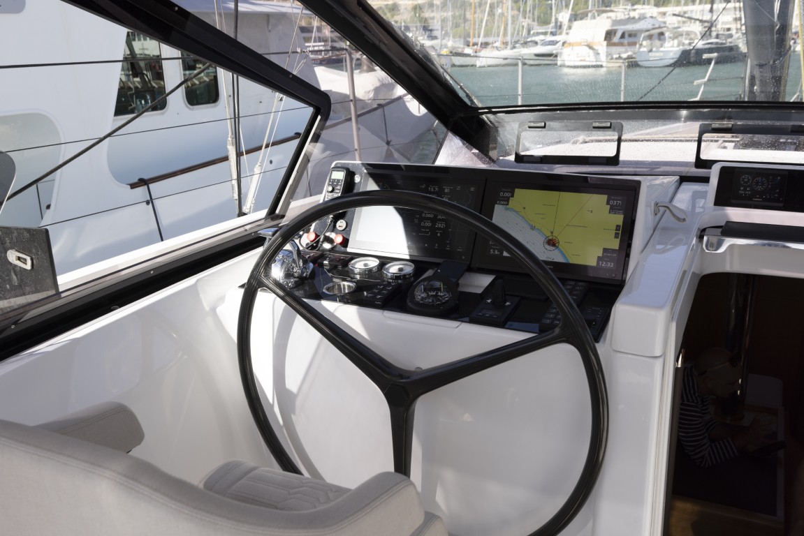 Quando la barca sbanda ed è mure a sinistra la posizione al timone diventa un po’ scomoda, perché ci si deve tenere in qualche modo alla poltrona, mentre mure a dritta ci si appoggia più naturalmente alla paratia della tuga. Nonostante i vetri della tuga e l’ottima protezione, grazie al ‘finestrino’ apribile accanto alla ruota si riesce sempre ad avere perfetta visibilità sulla parte alta della randa e le vele in generale. Una considerazione invece sulla posizione dei winch, che non ha convinto del tutto: quelli accanto al tambuccio d’ingresso gestiscono carichi molto importanti e sono vicini a una zona di grande passaggio, inoltre un eventuale malfunzionamento non è facilmente sopperibile da quelli verso poppa, distanti e comunque anche questi tra prendisole e salone. Anche il rivestimento del ponte di coperta, ricavato da stampa e che riprende il look del teak, ha mostrato di essere un po’ scivoloso quando bagnato, problema che sui prossimi modelli sarà risolto in modo diverso.
