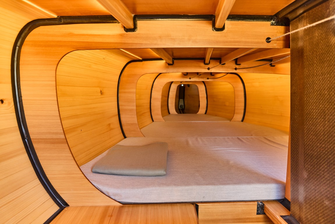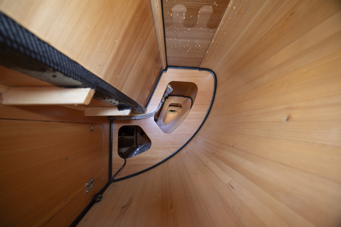 Una barca dalle forme così eleganti, con prua inversa, e costruita artigianalmente con qualità maniacale non può che essere anche veloce e divertente e così, già nel primo giorno di prove in mare, arriva il momento di saltare a bordo alla fine di una giornata ventosa e con mare abbastanza mosso che accennano entrambi a mollare un po’. Pensavo che mi sarei fatto letteralmente il bagno tra le onde e invece la barca è meno bagnata di quanto pensassi, almeno in queste condizioni, e cioè con un vento sui 14 nodi e mare con circa un metro d’onda. Certo, chi l’ha provata con ancora più vento non può dire la stessa cosa, in fondo è come una deriva con la differenza di avere una chiglia telescopica – con pescaggio variabile tra 1,10 e 1,90 metri – composta da lama di carbonio e bulbo in piombo da 340 kg. Tutte le manovre arrivano sugli strozzascotte e sul piccolo winch Harken raggruppati su un supporto ai piedi dell’albero di carbonio (made by Pauger). La randa è invece controllabile dal timoniere grazie a un sistema bozzelli al centro del pozzetto. Il Woy 26 porta un piano velico costituito da una randa da 21 mq, fiocco autovirante da 14 mq e gennaker da 70 mq. Ed è proprio da questo che iniziamo a navigare toccando punte di oltre 12 nodi in planata piena. Il Woy 26 non è ovviamente una barca per tutti, anche come prezzo, e soprattutto in queste condizioni meteo bisogna sapere cosa si fa, ma la barca rimane sempre gestibile e mai nervosa. Il passaggio sulle onde è più morbido del previsto per essere barca che idealmente non nasce per condizioni simili. Grazie anche all’equipaggio composto dallo stesso Jan e da un velista esperto la navigazione è perfetta e la barca esprime il massimo delle sue potenzialità. Le strambate sono rapide e mai pericolose, anche perché le scotte sono tutte lì, a portata di mano, e il boma non è troppo basso. Fino a che il vento regge con il gennaker è difficile scendere sotto ai 10/11 nodi. Poi inizia a calare e di bolina con il fiocco tutto diventa più calmo e si naviga tra i 6 e i 7 nodi con angoli al vento reale sui 35° (i dati sono gestiti da un piccolo display Sailmon). Sottocoperta la barca rimane abbastanza asciutta nonostante i due boccaporti protetti da chiusure tessili. Non c’è ovviamente lo spazio per stare in piedi ma tutta la parte di prua può accogliere dei materassi dove riposare e godersi lo spettacolo di una costruzione in legno che non smette di stupire. Grazie alle sue caratteristiche la giuria ha deciso di assegnare al Woy 26 la menzione speciale ‘One to watch’, ovvero una barca da tenere d’occhio.