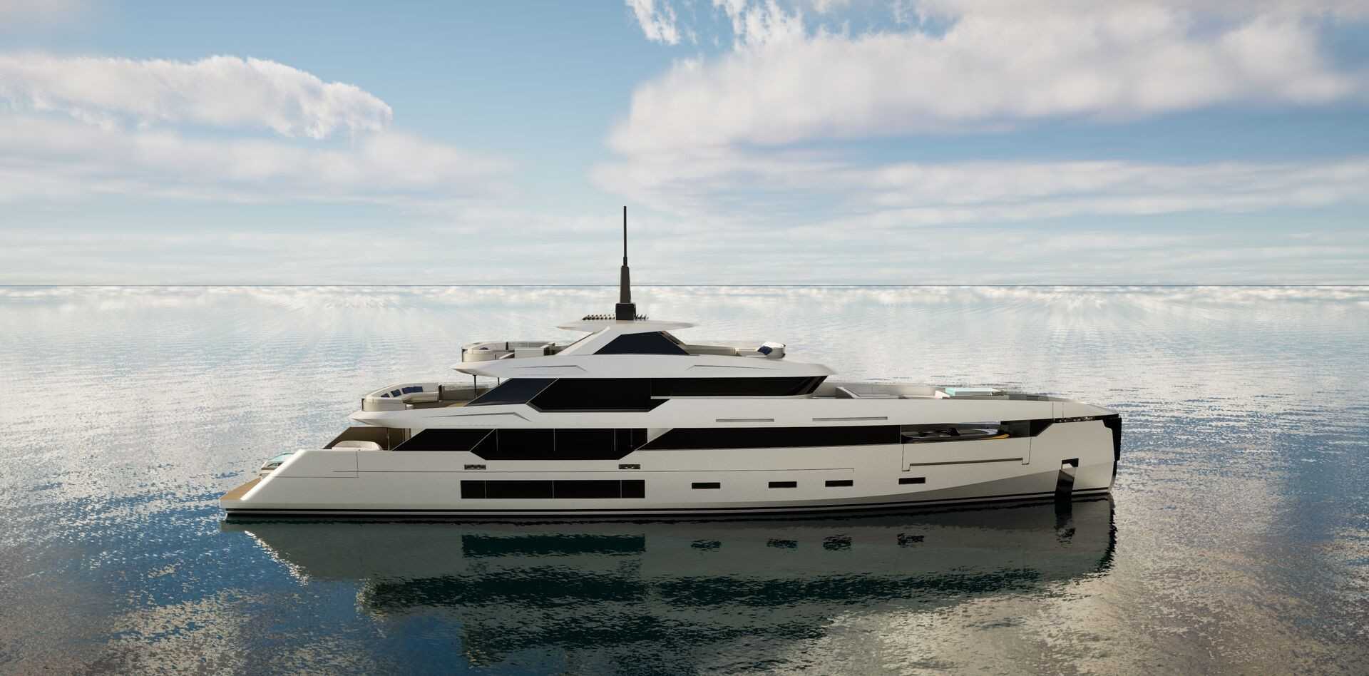 All’interno, luce e trasparenza definiscono l’atmosfera, con cabine ospiti dotate di ampie finestrature nello scafo di circa due metri di lunghezza in costante dialogo visivo con il mare. I due saloni con le vetrate a tutta altezza e parapetti in vetro danno una percezione ampliata dello spazio. Dal lato esterni: a poppa si trova un ampio cockpit con grande prendisole e area lounge, mentre a prua una piscina circondata da un’area solarium offre un’area privata. Il sundeck, lungo quasi 18 metri, è concepito come un autentico living all’aperto con vasca idromassaggio a prua e zona pranzo riparata da un roll bar con hard top apribile. Infine, il beach club ha un’apertura a filo ponte e un garage di ampie dimensioni.
