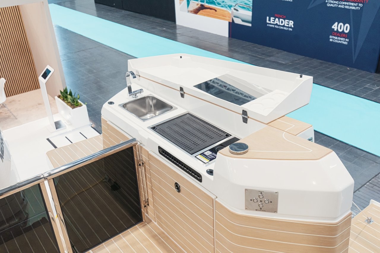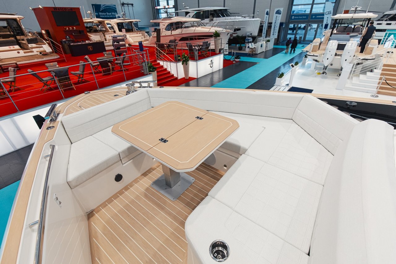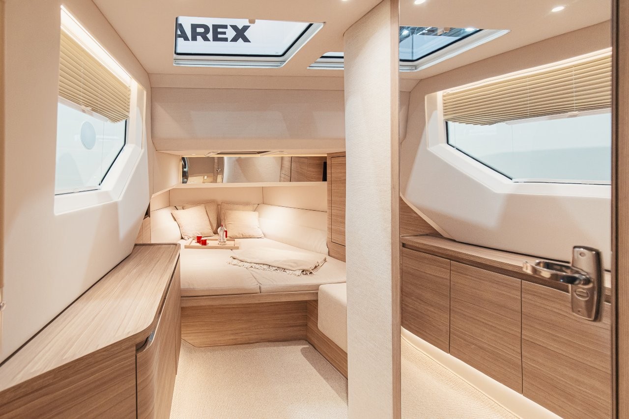 Il concetto chiave resta quello che ha reso riconoscibile il marchio finlandese: la timoneria closed–open. Sulla 460 GTC il sistema viene ulteriormente sviluppato grazie a pannelli vetrati scorrevoli, tetto retraibile e aperture laterali che trasformano progressivamente l’imbarcazione da cabinata chiusa a piattaforma completamente aperta. Il risultato è un ponte principale continuo, senza interruzioni tra prua e poppa, con una circolazione fluida che ricorda quella di unità ben più grandi. Il salone integra timoneria, cucina, zona pranzo e lounge in un unico ambiente. La plancia, ribassata e pulita, può ospitare fino a tre display Simrad da 16”, con comandi concentrati e ben leggibili anche in navigazione veloce. Le doppie porte laterali permettono l’accesso diretto ai passavanti, mentre a prua una soluzione a doppia anta consente di collegare il salone al grande prendisole convertibile anteriore. A poppa una finestra a mezza altezza e una porta laterale aprono verso il pozzetto, rafforzando il rapporto diretto con il mare.