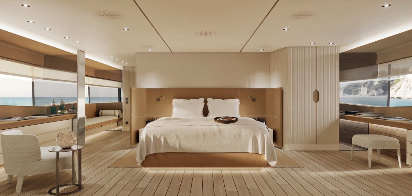 Le geometrie di poppa e fiancate sono state ridisegnate per migliorare la distribuzione dei volumi interni senza incrementare la massa visiva della sovrastruttura. La linea di cintura rimane pulita e continua, mentre l’assenza di scala esterna poppiera sul ponte principale consente di liberare superficie utile e ridurre interferenze strutturali tra ponti. L’unità si sviluppa su tre ponti più sun deck. La superficie complessiva tra interni ed esterni supera i 300 mq. Il layout standard prevede cinque cabine ospiti per 10 persone, con suite armatoriale sul main deck e quattro cabine sul lower deck. Gli spazi equipaggio sono separati e dimensionati per sei membri con cabina comandante sull’upper deck e tre cabine a prua nel ponte inferiore.