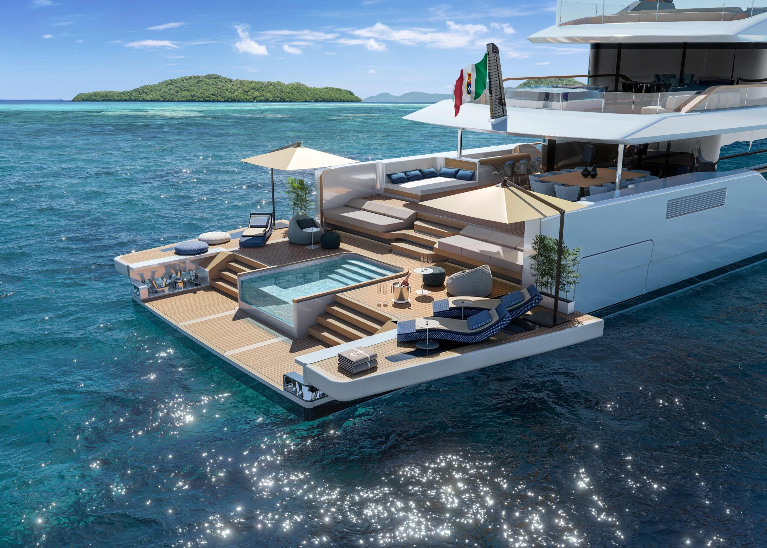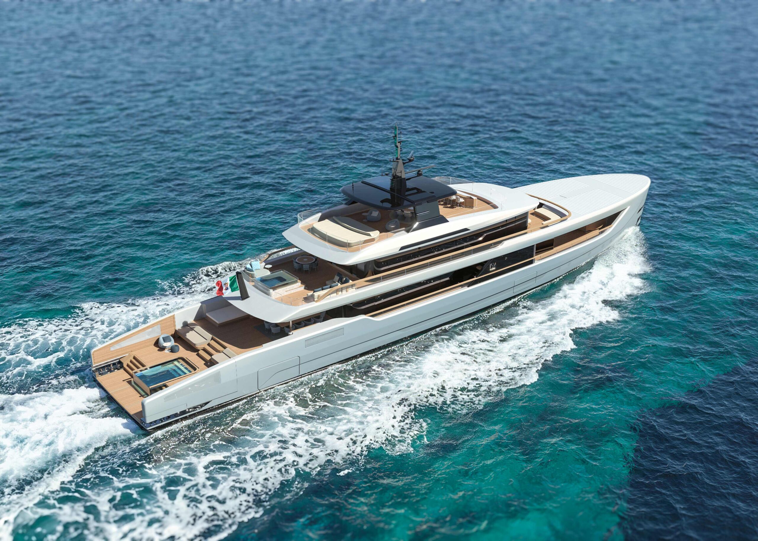 Il centro dell’innovazione risiede nel ponte principale, concepito come una piattaforma dinamica che può evolversi secondo le visioni dell’armatore. L’area prodiera può infatti essere configurata come una suite padronale con terrazza privata, una zona dining per momenti conviviali o un’area dedicata al benessere con palestra panoramica e Spa dotata di sauna e idromassaggio. La versatilità è ulteriormente arricchita da un tetto apribile con pannelli modulabili, che permette di trasformare la lounge esterna in base alle necessità d’uso e alle condizioni climatiche, garantendo sempre il massimo comfort.