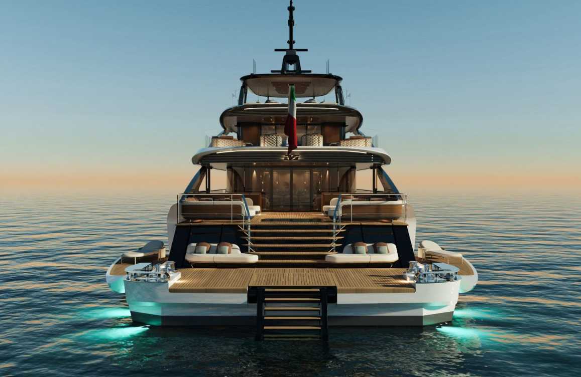 Firmato da Alberto Mancini e Pierluigi Ausonio, lo yacht introduce, tra le varie novità, anche un nuovo stilema per la gamma: una scenografica scalinata centrale che collega il pozzetto alla piattaforma bagno