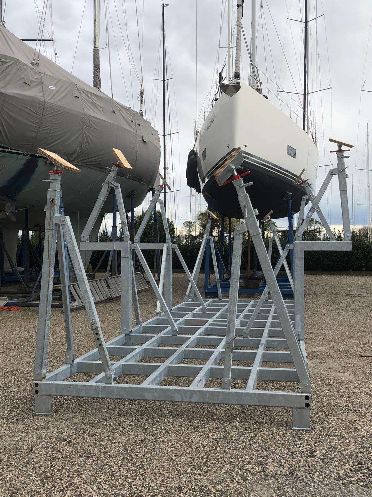 La produzione comprende anche le selle statiche St da piazzale e carenaggio, con larghezze standard tra 1.800 e 2.500 millimetri, lunghezze da 4.000 a 9.000 millimetri e portate certificate CE da 10 a 70 tonnellate. I cavalletti regolabili, da quattro a dieci elementi, sono telescopici e inclinabili e integrano testa a sfera e vite di regolazione per seguire con precisione la geometria dello scafo.