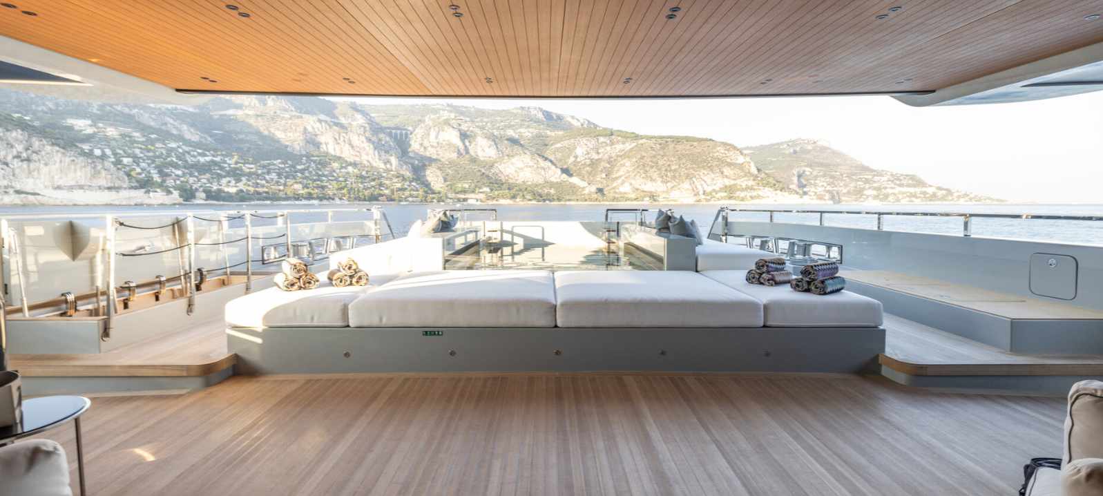 Il ponte principale di Virtuosity ospita un salone open-plan che si estende verso l’esterno dove si trova una piscina inserita tra ampi prendisole; sul ponte superiore una sky lounge panoramica con vetrate a tutta altezza offre una vista ininterrotta sul mare. Il beach club invece, a livello del mare, è una zona wellness dotata di spa con hammam, sauna e palestra attrezzata ed è dotato di terrazze abbattibili che ampliano la superficie.