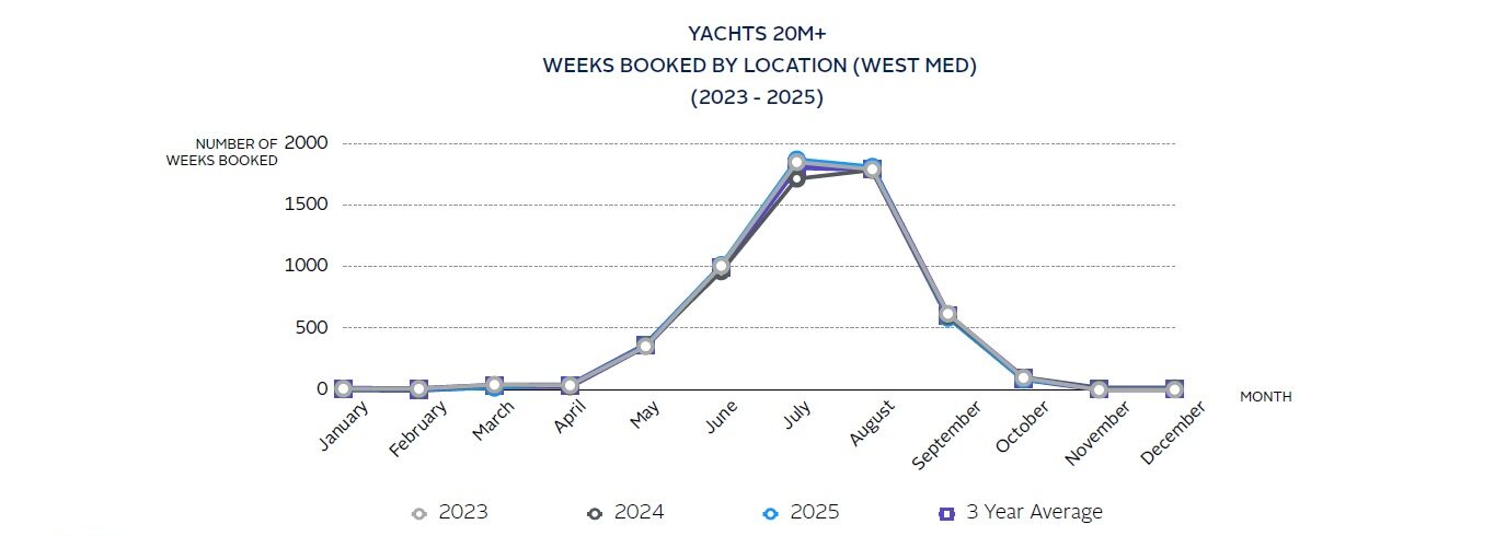 Nel Mediterraneo occidentale il quadro è simile: +9% di yacht prenotati dal 2023 al 2025 e una quota del 37% sul totale globale. La domanda è concentrata nella fascia 20-40 m con oltre il 60% delle prenotazioni totali. La Francia rimane la destinazione di riferimento con il 46% delle prenotazioni. L’Italia segue con il 39%, mentre Spagna e Malta si dividono il restante 15%. La durata media scende a 7 giorni, ma la media settimanale per yacht sale a 6,3.