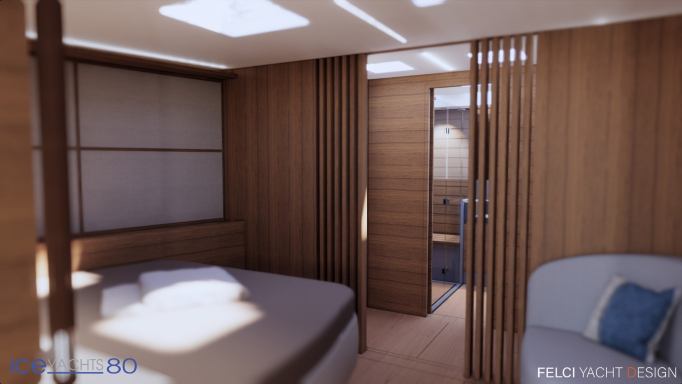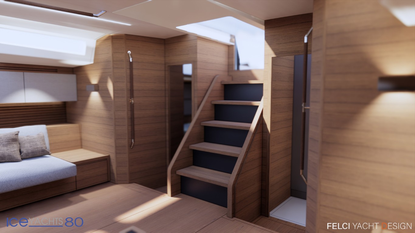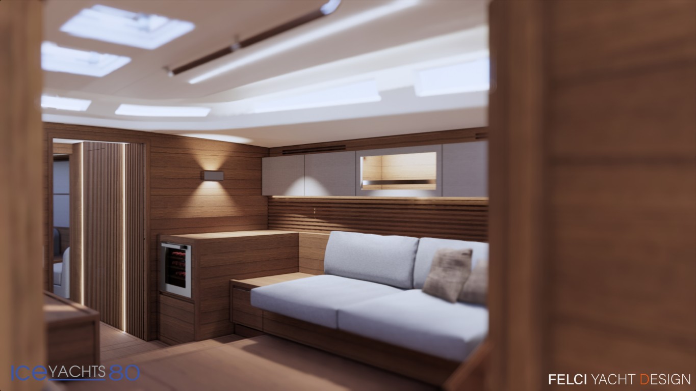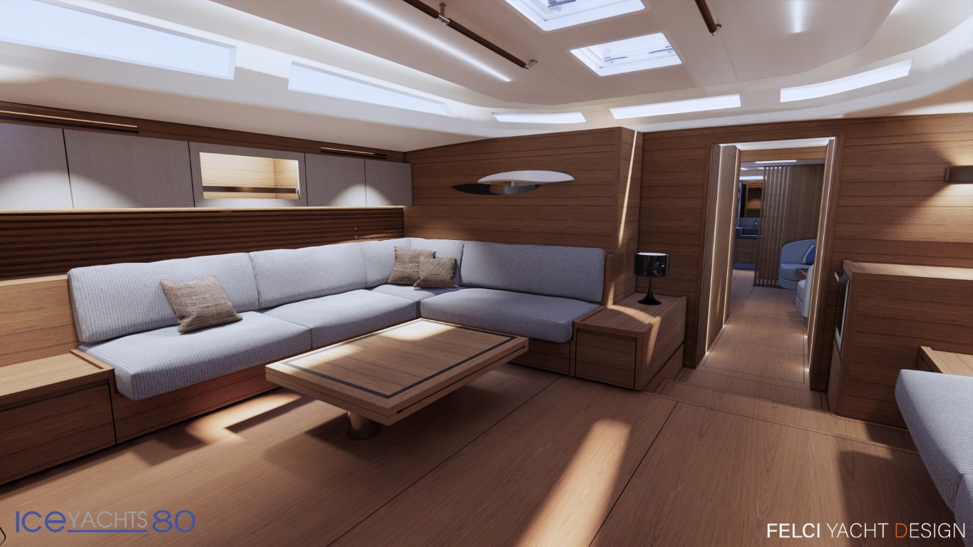 Il cantiere Ice Yachts presenta la versione Platinum del modello Ice 80, un 24 metri full carbon con linee di carena firmate da Umberto Felci Yacht Design che porta all’estremo il comfort di bordo esaltando anche dinamismo e prestazioni. Riguardo alle appendici l’Ice 80 è configurato con chiglia retrattile a controllo numerico realizzata da Apm Keels; il pescaggio variabile da 4,70 metri a 3 permette l’accesso alle zone costiere meno profonde. La timoneria sfrutta boccole race della francese JP3 e asse del timone in carbonio realizzato in autoclave per un controllo totale e il massimo piacere al timone. Su scafo e coperta è stato realizzato uno specifico cappotto da 4,7 mm che permette la perfetta stesura della verniciatura metallizzata a triplo strato migliorando ulteriormente il comfort acustico. Il sistema antivegetativo a ultrasuoni, composto da sensori che emettono micro vibrazioni, impedisce ai microrganismi di aderire allo scafo e permette all’antivegetativa una durata fino a 4 anni.